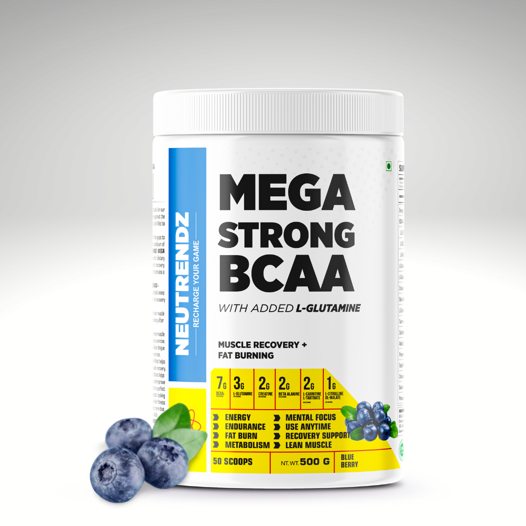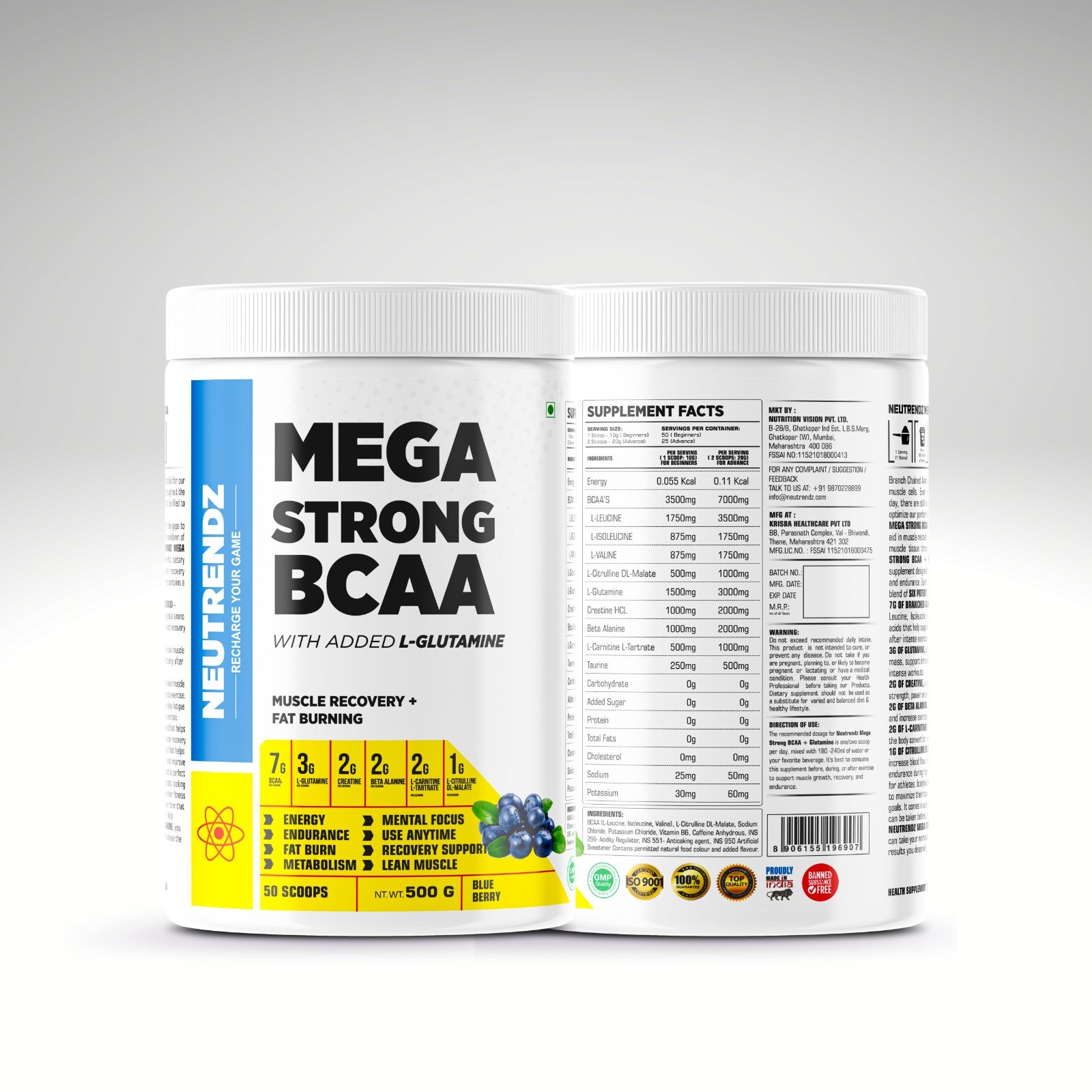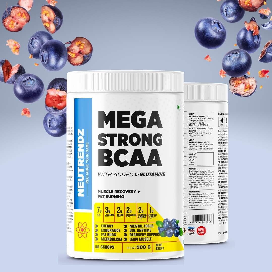 NEUTRENDZ Mega Strong BCAA + Glutamine | 7g BCAAs, 3g Glutamine, 2g Creatine, 2g Beta-Alanine | Muscle Recovery + Fat Burn | 500g Powder | Intra/Post-Workout Supplement | Blueberry Flavor