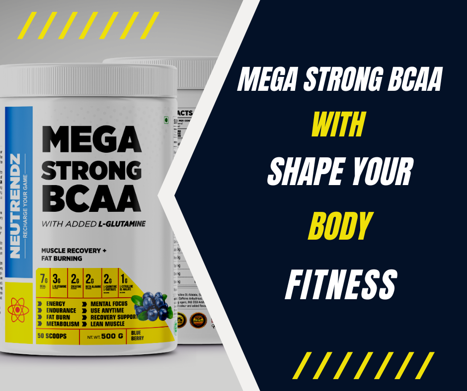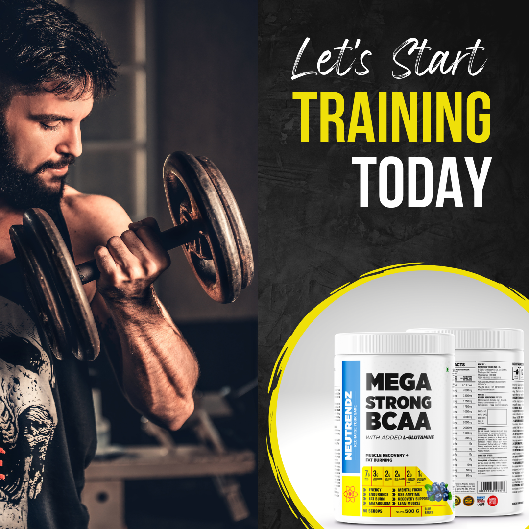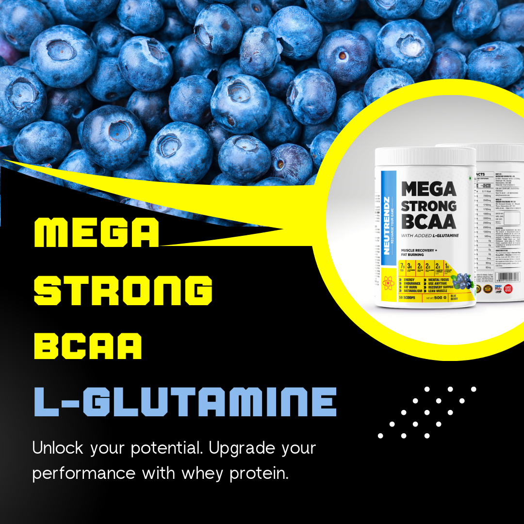 NEUTRENDZ Mega Strong BCAA + Glutamine | 7g BCAAs, 3g Glutamine, 2g Creatine, 2g Beta-Alanine | Muscle Recovery + Fat Burn | 500g Powder | Intra/Post-Workout Supplement | Blueberry Flavor