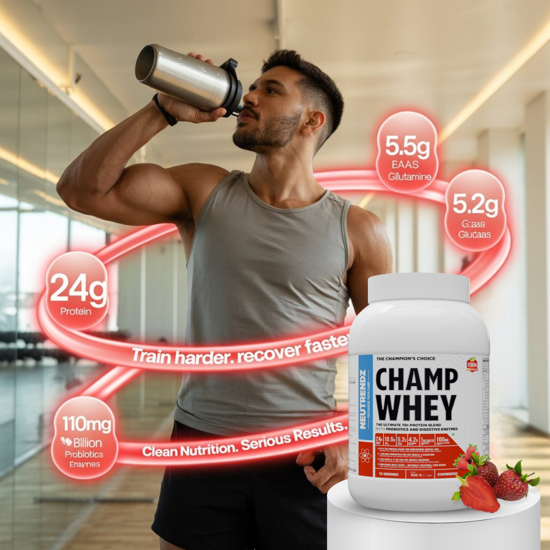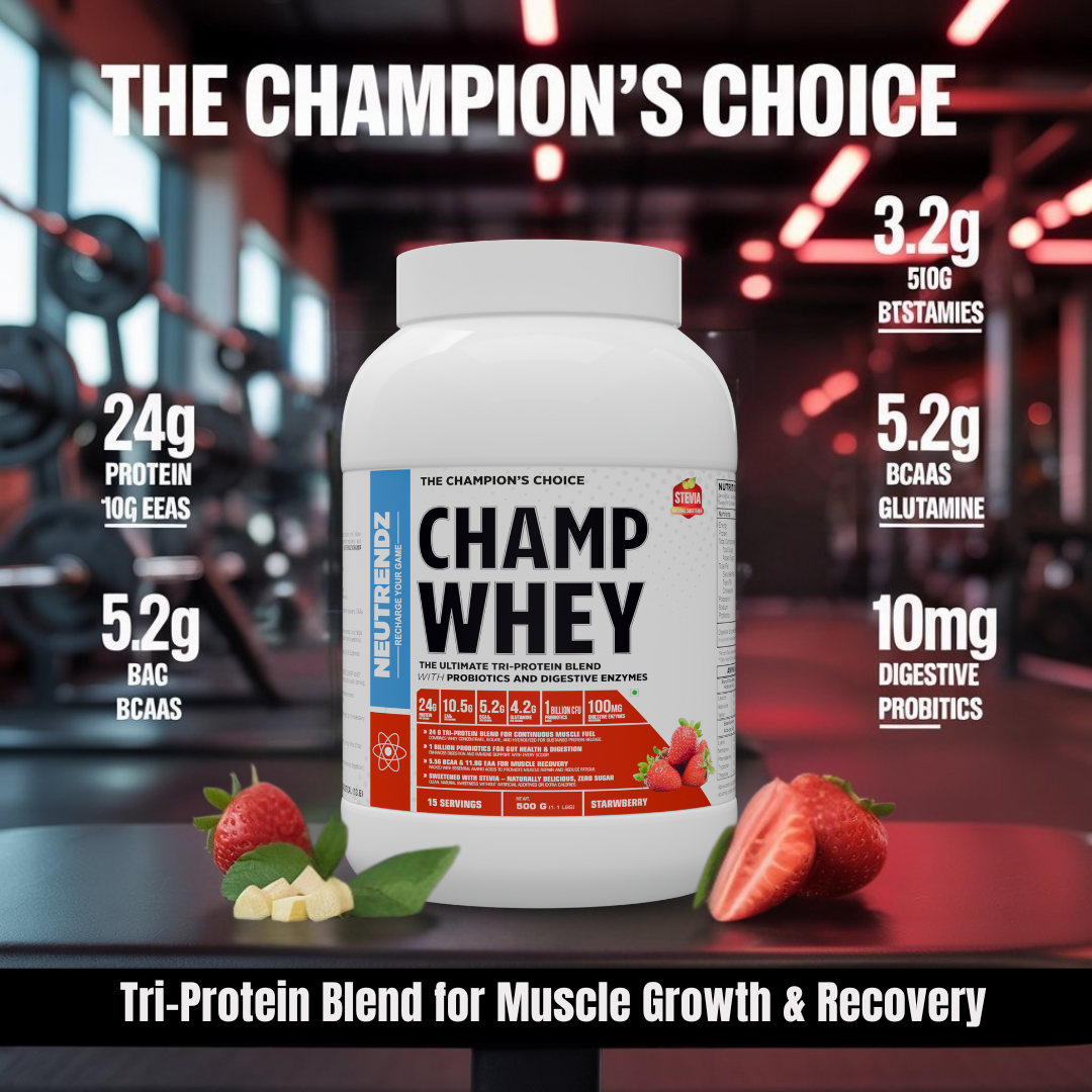 NEUTRENDZ CHAMP WHEY – Premium Tri-Protein Blend | 24g Protein | 1 Billion Probiotics | Digestive Enzymes | 5.2g BCAA | 10.5g EAA | Sweetened with Stevia | 500g ( STRAWBEERY )